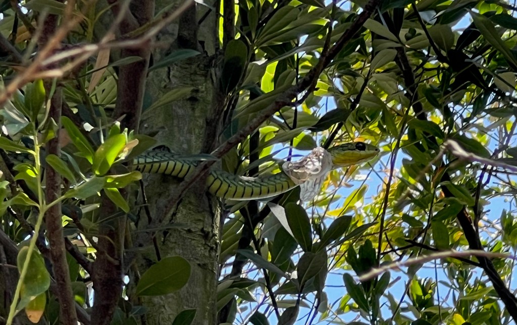 As I stepped outside, he slowly slithered back into the trees. I caught a few photos and said, “Till next time, you beaut. You’re welcome to stay as long as I’m here, neighbour.”